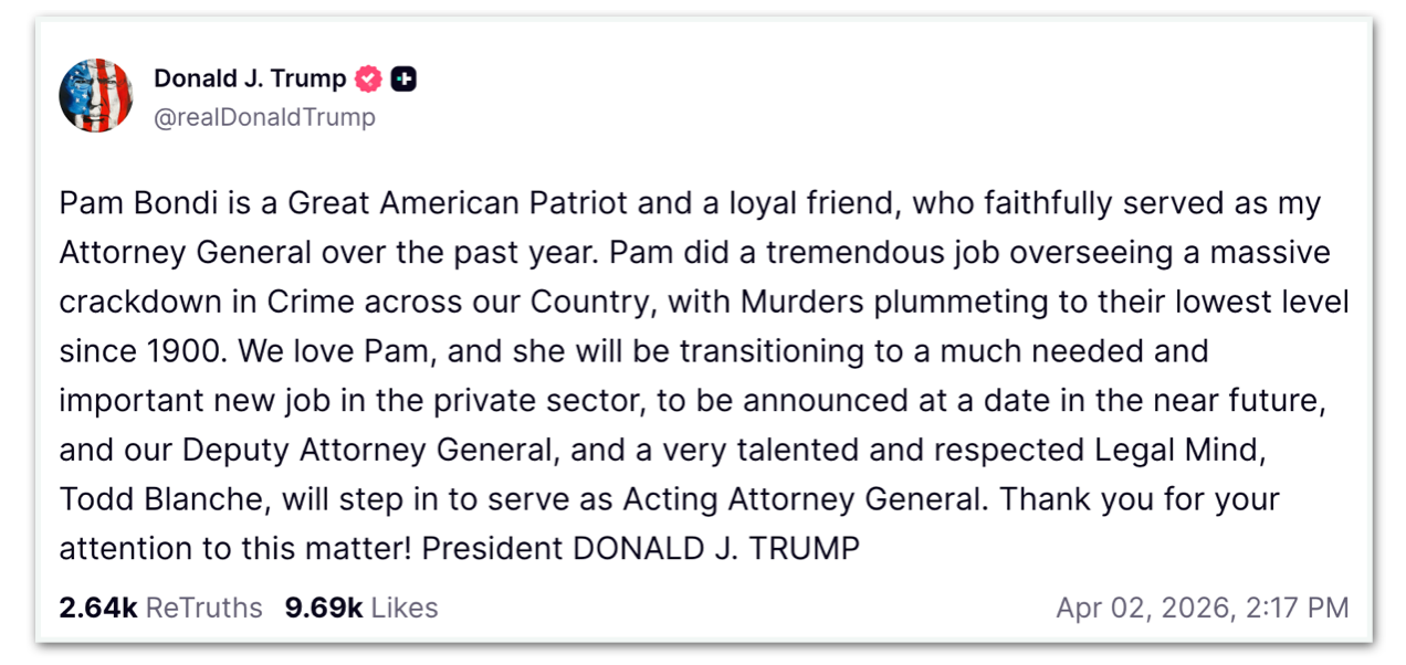 Bondi chefiava o cargo desde o início do 2º mandato de Trump; mesmo com a demissão, ele disse que seu trabalho foi “excepcional” O presidente