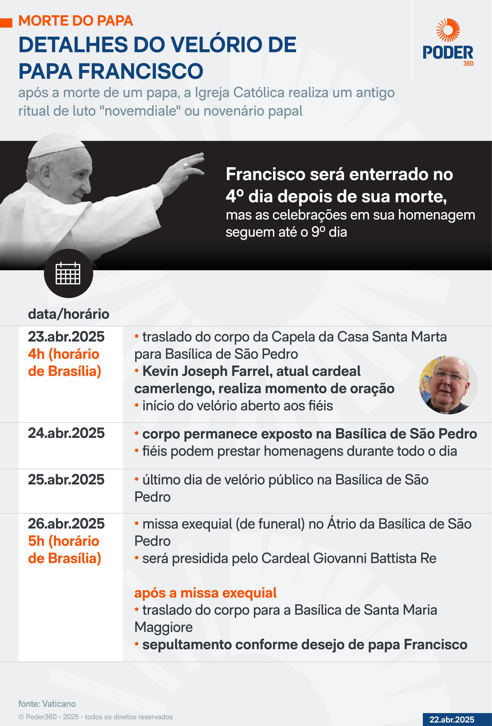 A capela-ardente dedicada a Jorge Mario Bergoglio ficará aberta ao público até a noite desta 6ª feira (25.abr). Na ocasião, o cardeal camerlengo, Kevin Farrell, conduzirá o rito de fechamento do caixão, marcando o início das cerimônias fúnebres.