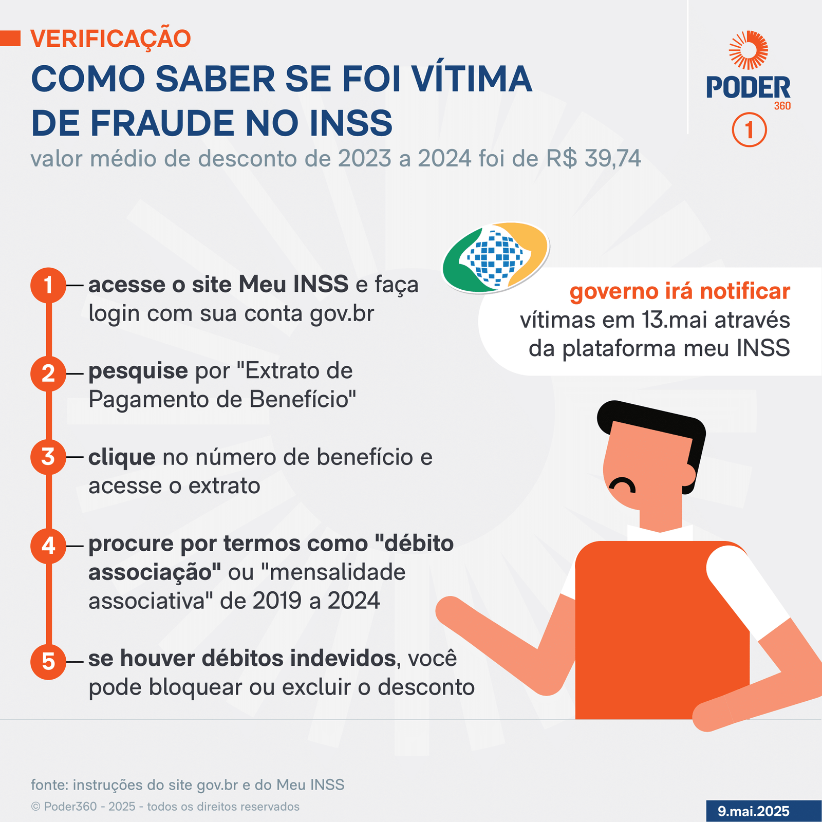 O Poder360 preparou uma reportagem sobre como notificar fraudes em benefícios do INSS para, eventualmente, conseguir o ressarcimento dos valores. Leia mais aqui.