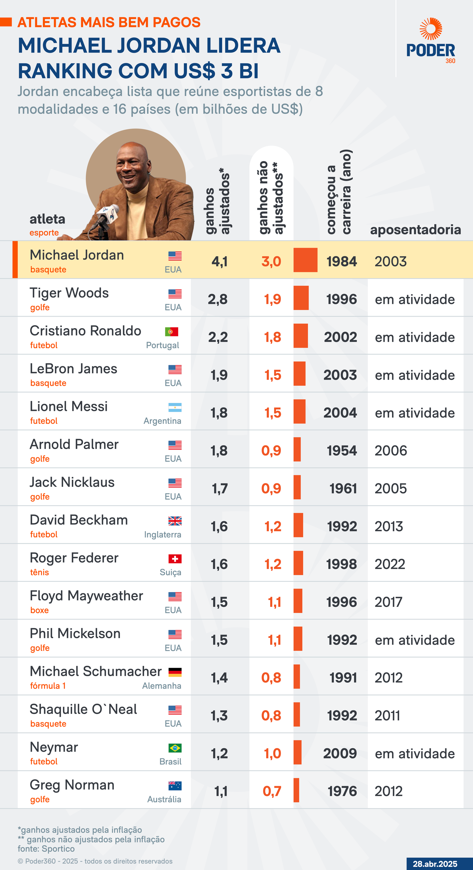 Com US$ 3 bi, Jordan é o atleta mais bem pago da história 28 de abril de 2025 Nenhum comentário Carregar Mais »