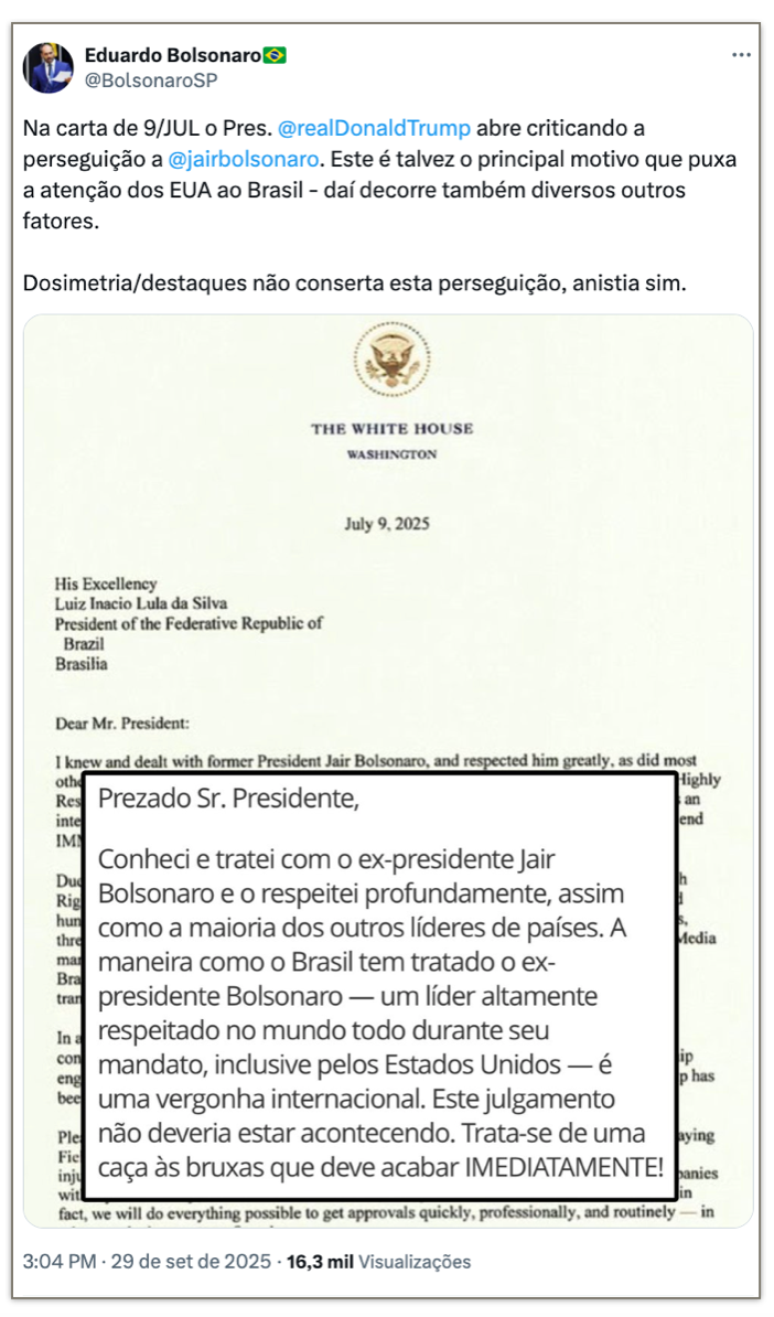 Eduardo Bolsonaro usa carta de Trump para criticar dosimetria 29 de setembro de 2025 Nenhum comentário Carregar Mais »