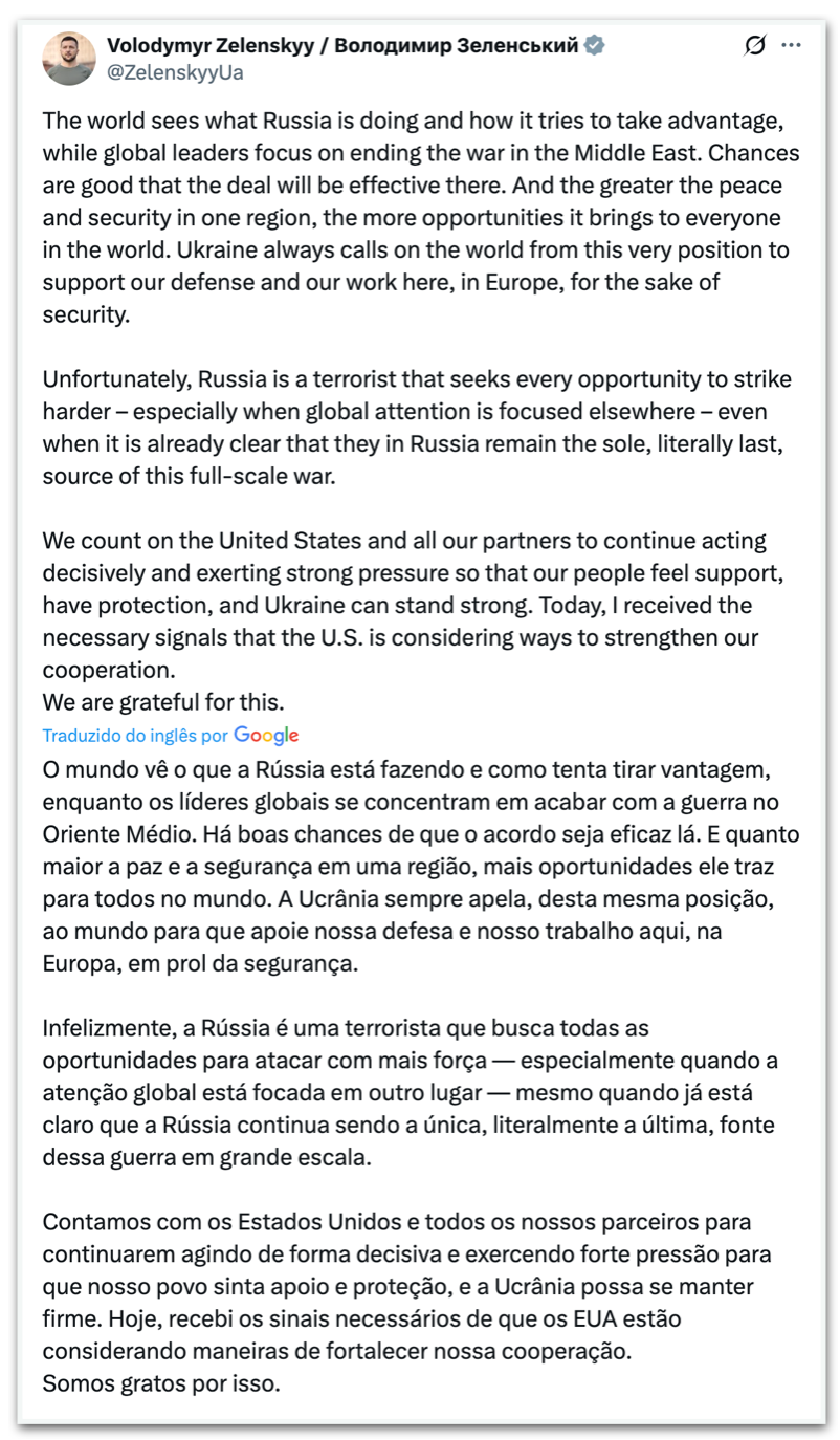 Zelensky elogia Trump por Gaza e cobra “diplomacia real” da Rússia 11 de outubro de 2025 Nenhum comentário Carregar Mais »
