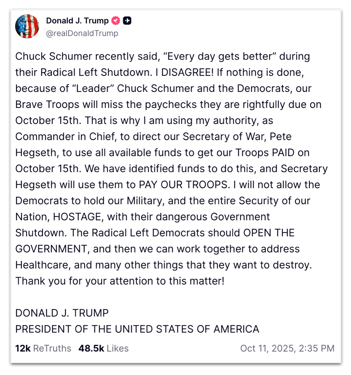 Trump diz que usará todos os recursos disponíveis para pagar militares 11 de outubro de 2025 Nenhum comentário Carregar Mais »