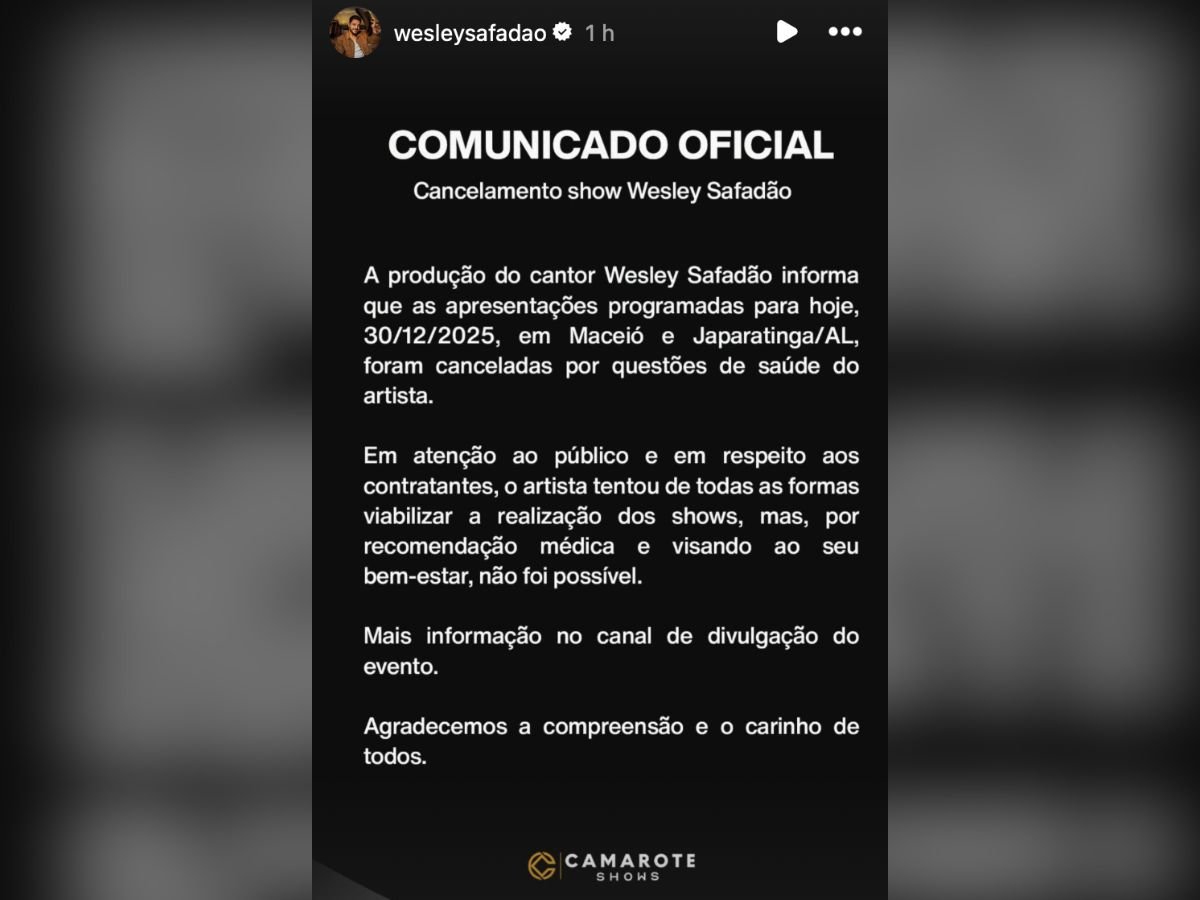 Wesley Safadão cancela apresentações em Alagoas por motivos de saúde 30 de dezembro de 2025 Nenhum comentário Carregar Mais »