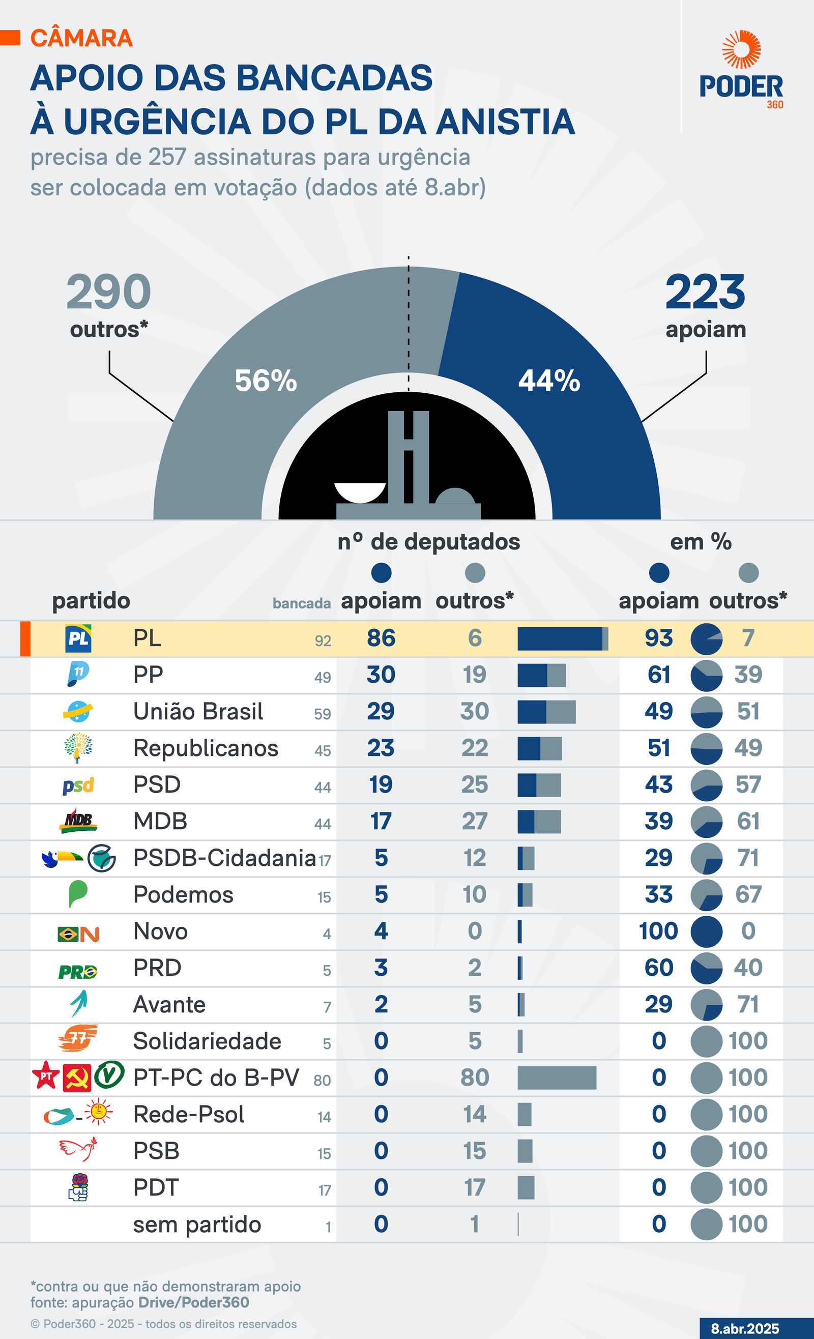 O líder do PL na Câmara, Sóstenes Cavalcante (RJ), afirmou que, até esta 3ª feira (8.abr.2025), 223 deputados assinaram o pedido de urgência do PL (projeto de lei) 2.858 de 2022, que anistia os condenados pelos atos extremistas do 8 de Janeiro. Para ser pautada em plenário, 257 congressistas da Casa Baixa precisam apoiar a medida, que acelera a tramitação do texto.