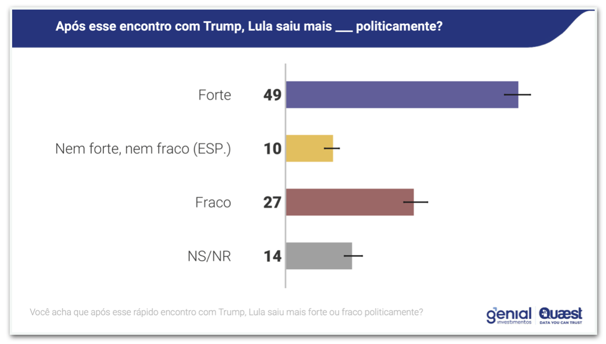 Outros 27% declararam que Lula saiu mais fraco do encontro com o republicano. Já 10% declararam que o petista não saiu nem mais forte, nem mais fraco. Os que não souberam ou não responderam somam 10%.
