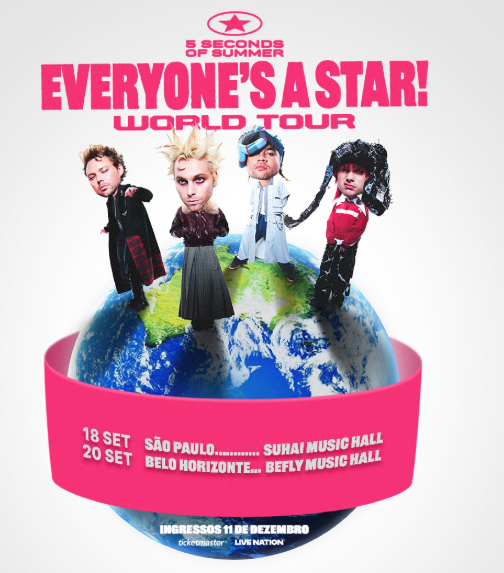 Após pouco mais de dois anos sem lançamentos, o 5 Seconds of Summer retorna com um novo álbum, “Everyone’s A Star!”, que marca também o início de uma turnê internacional. O grupo incluiu o Brasil no itinerário, com shows em São Paulo, no Suhai Music Hall, em 18 de setembro, e em Belo Horizonte, no BeFly Music Hall, no dia 20 do mesmo mês. Os ingressos começarão a ser vendidos nesta quarta-feira (10/12) para fãs selecionados no site da Ticketmaster.
