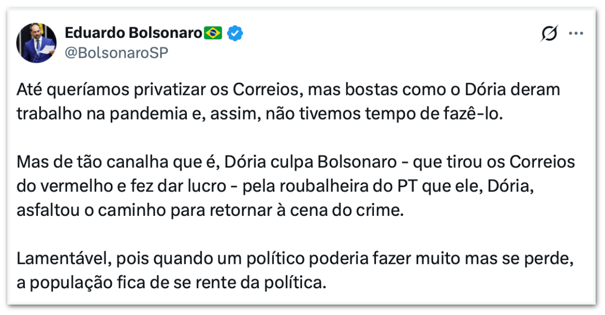“O presidente Bolsonaro teria sido reeleito se tivesse apoiado a vacina e tivesse apoiado uma conduta correta na saúde pública no Brasil. Foi um erro. Mas nós não estamos aqui para julgar o passado. Nós estamos aqui para olhar o futuro e, principalmente, um futuro melhor para o Brasil. Sem ressentimentos”, afirmou Doria sobre a pandemia, que causou 717 mil mortes no Brasil sob gestão de Bolsonaro.
