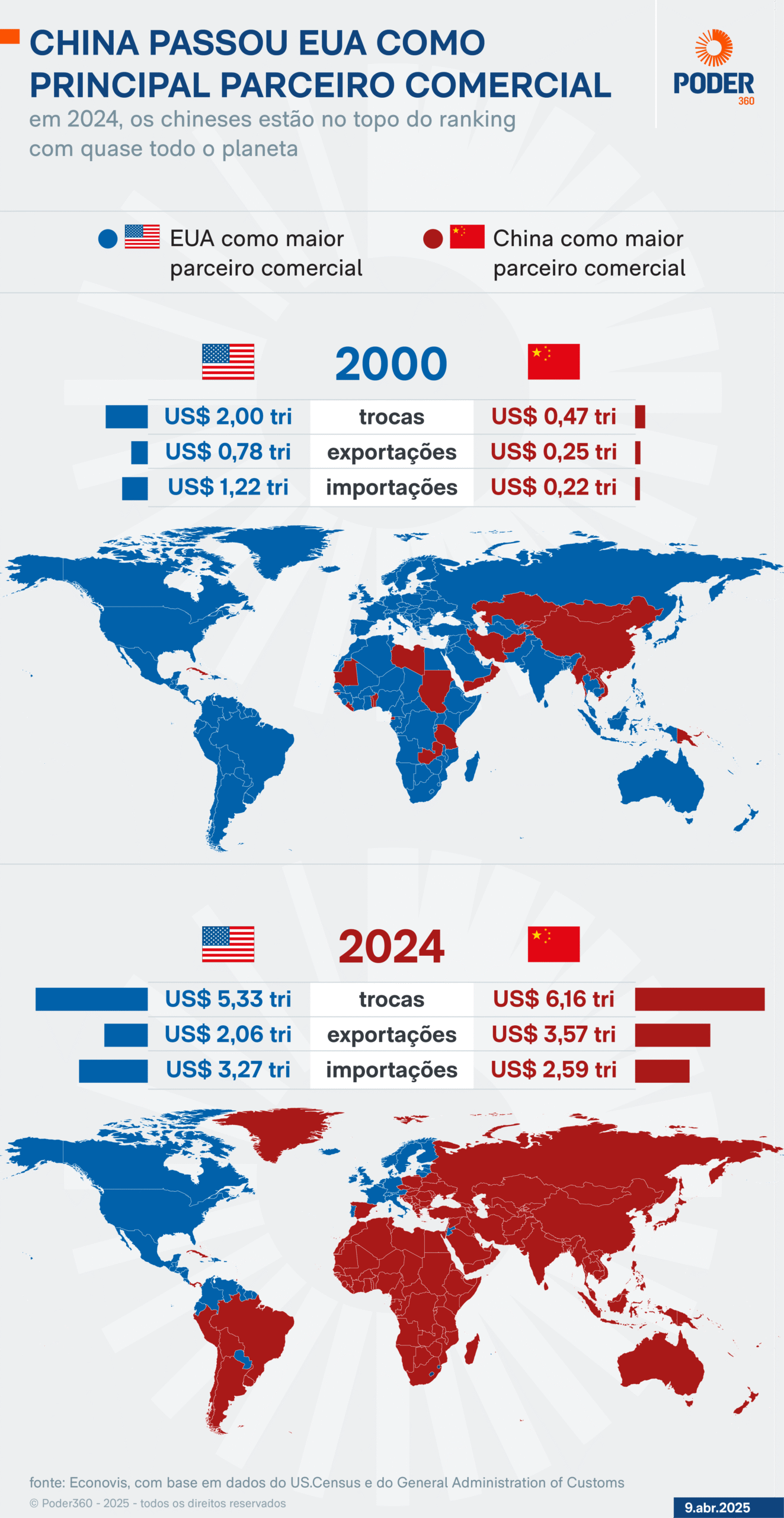 Basta olhar o mapa do comércio mundial para entender o que se passa. No ano 2000, a imensa maioria dos países tinha como principal parceiro os Estados Unidos. O mapa era azul. Em 2024 (dados consolidados mais recentes), o líder comercial na maioria dos países passou a ser a China. O mapa ficou vermelho, como mostra o infográfico: