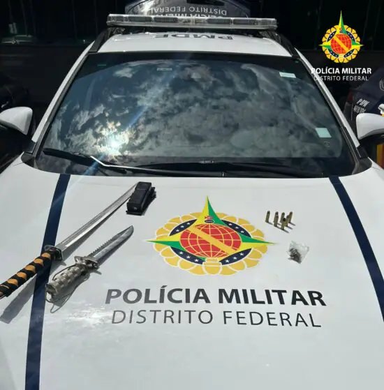 A equipe de policiais militares de rádio patrulhamento (RP30) realizou a intervenção, que resultou na prisão do homem e na apreensão de diversos materiais em seu poder: sete munições calibre .38, uma espada, uma faca, uma arma de choque e uma porção de maconha.