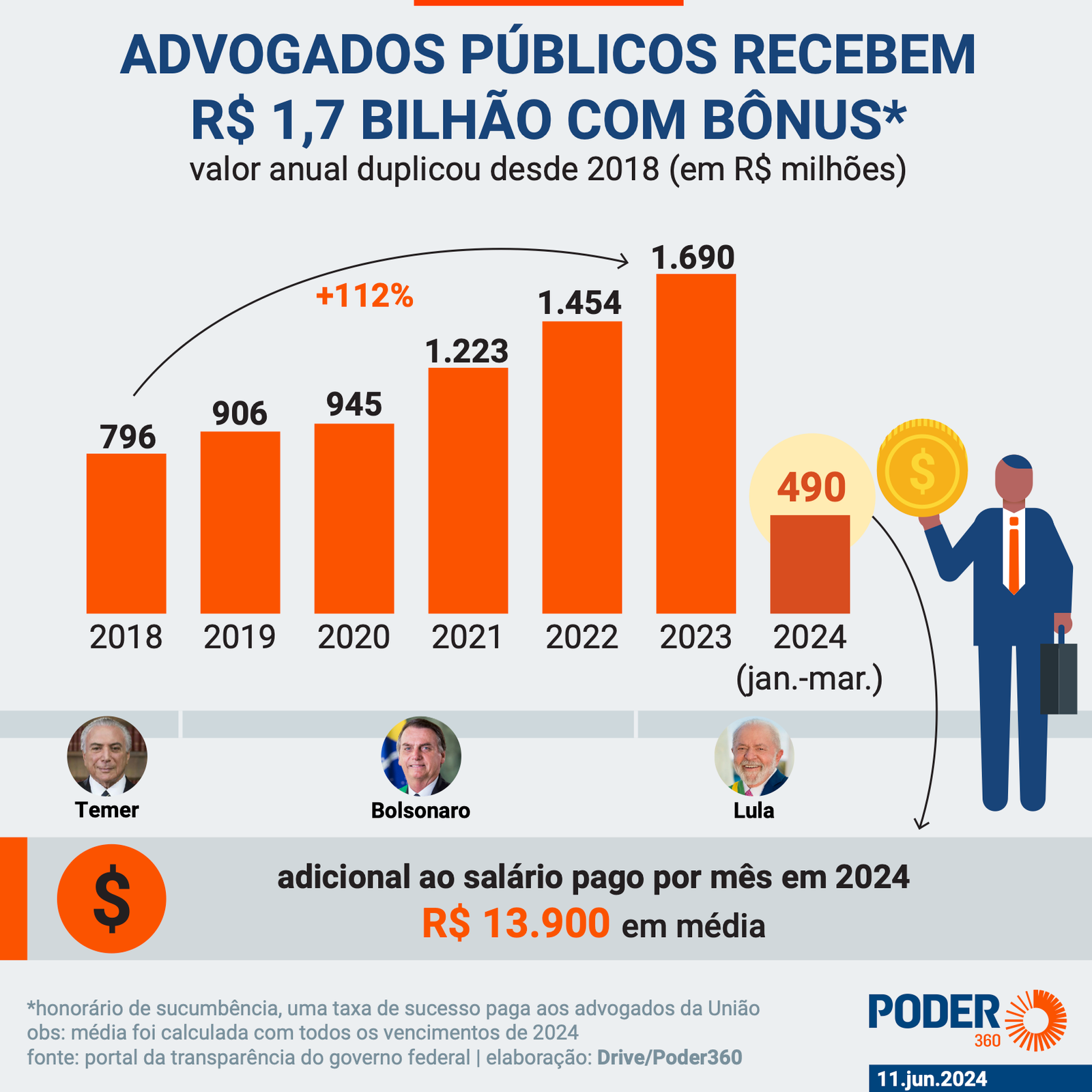 O valor gasto com o bônus pago a advogados públicos ligados à União cresceu 112% de 2018 a 2023. Foram de R$ 796 milhões para R$ 1,7 bilhão no ano passado. Nesse período, a inflação foi de 32,5%.