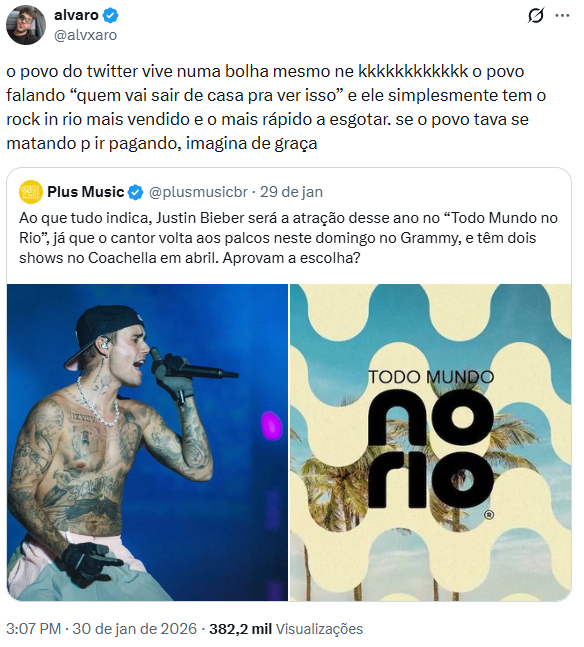 A possível vinda de Justin Bieber ao Rio de Janeiro ganhou força nas redes sociais nesta sexta-feira (30/1) e provocou reações imediatas; entre elas, a do influenciador Álvaro Xaro, que saiu em defesa do artista diante das críticas. Em um post no X, Álvaro comentou que existe uma “bolha” na rede social ao minimizar o alcance do cantor, lembrando que Bieber segue como um dos artistas mais vendidos do mundo e com ingressos esgotados rapidamente em suas turnês.