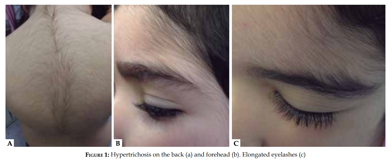 Fotos de crianças com crescimento de pelos pelo contato com minoxidil em publicação em artigo científico