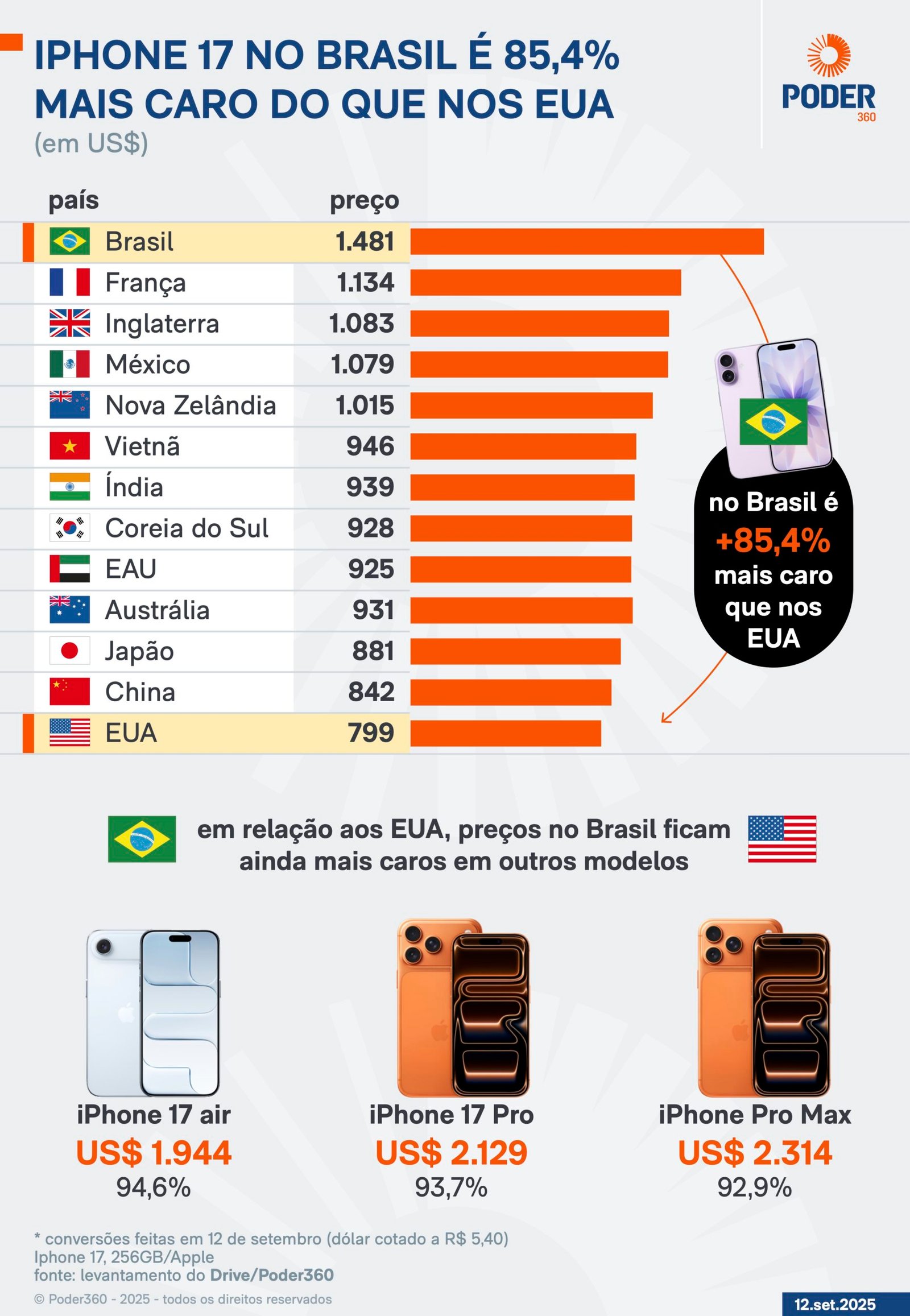 Dos 13 países analisados pelo levantamento do Drive/Poder360, o Brasil aparece como o mercado mais caro para a compra do dispositivo. A cotação do dólar considerada foi a R$ 5,40, cotado em 12 de setembro de 2025.