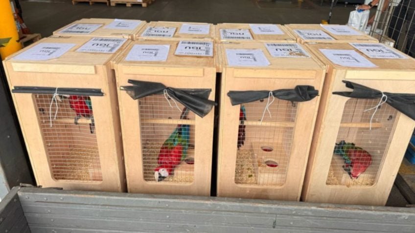 Oito araras-vermelhas resgatadas do tráfico de animais silvestres em outubro de 2024, em Guararema (SP), tiveram um final feliz. Depois de 6 meses em reabilitação no Cetras-SP (Centro de Triagem e Recuperação de Animais Silvestres de São Paulo), vinculado à Secretaria de Meio Ambiente, Infraestrutura e Logística do Estado de São Paulo, as aves foram na 2ª feira (31.mar.2025) para o Parque das Aves, em Foz do Iguaçu (PR).