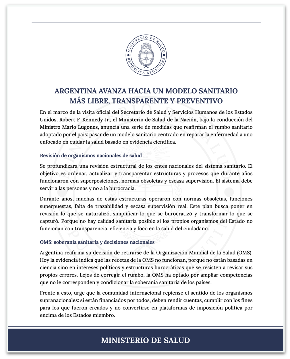 Além de confirmar a saída da Argentina da OMS, o ministério encabeçado por Mario Lugones anunciou uma série de medidas “que confirmam a orientação de saúde adotada pelo país: passar de um modelo de saúde focado no tratamento de doenças para um modelo focado na proteção da saúde com base em evidências científicas”.