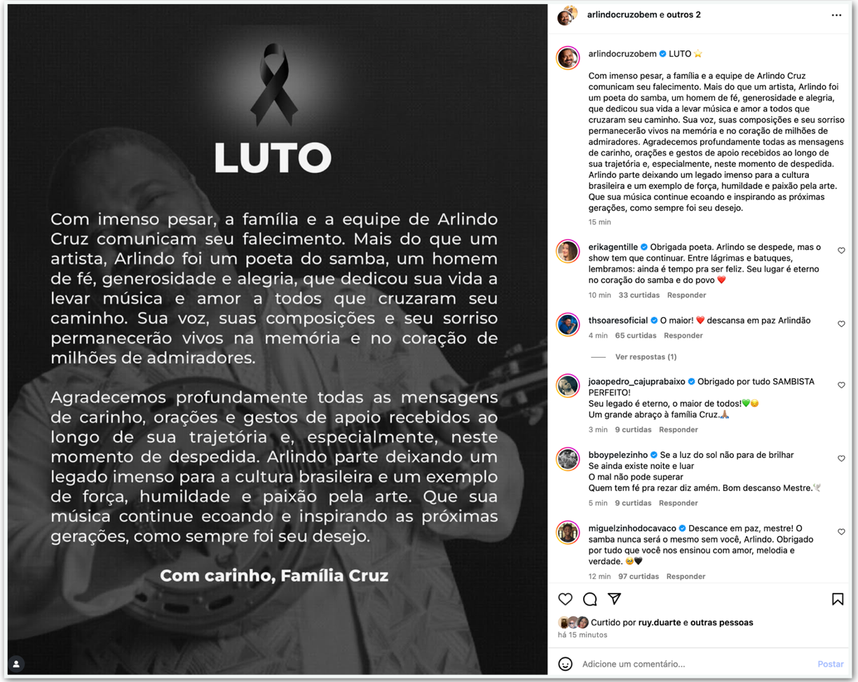 A família divulgou uma nota de pesar depois da confirmação da morte. “Mais do que um artista, Arlindo foi um poeta do samba, um homem de fé, generosidade e alegria, que dedicou sua vida a levar música e amor a todos que cruzaram seu caminho. Sua voz, suas composições e seu sorriso permanecerão vivos na memória e no coração de milhões de admiradores”, diz o texto.