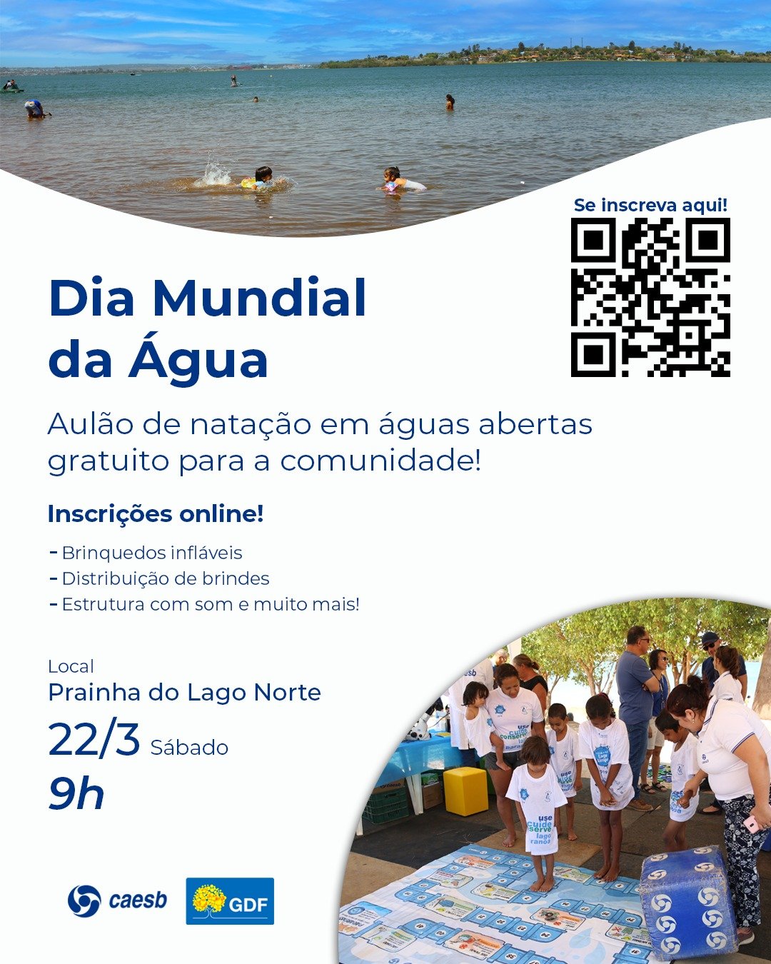 O Dia Mundial da Água será comemorado na Prainha do Lago Norte, no Lago Paranoá, conhecido por suas águas calmas e de qualidade garantida pela Caesb. O aulão de natação nesse local reforça o compromisso da companhia em manter um ambiente aquático limpo e equilibrado para esse tipo de atividade.