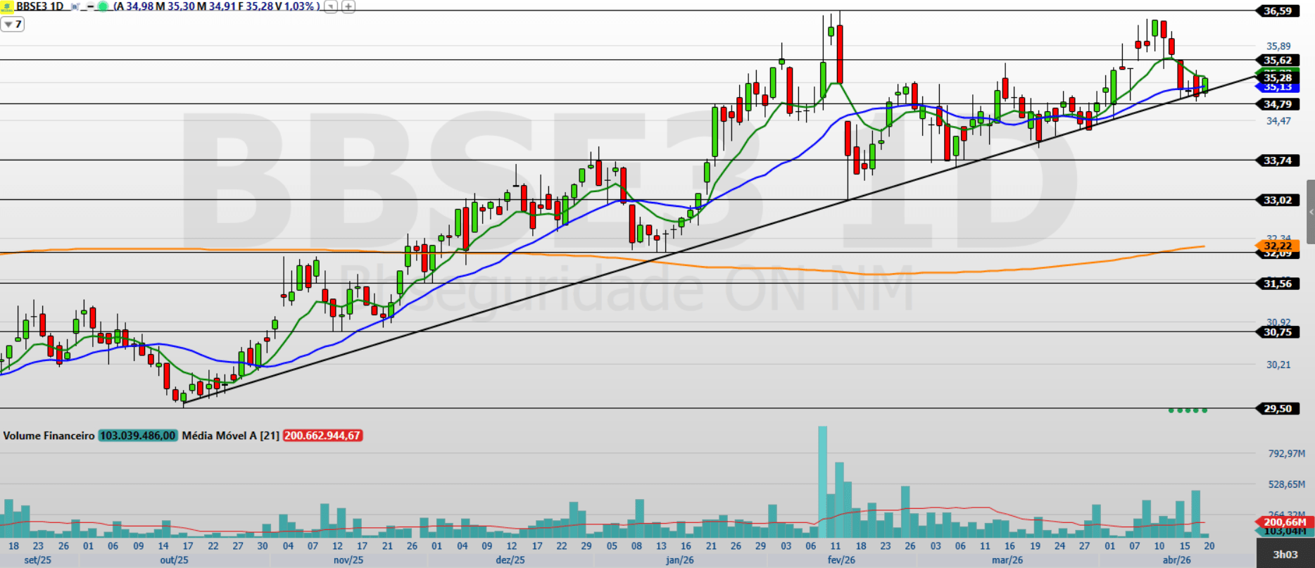 As ações da BB Seguridade (BBSE3) seguem com uma estrutura técnica positiva, sustentadas pela tendência de alta tanto no curto quanto no médio prazo. No último pregão, o papel avançou 1,03%, encerrando cotado a R$ 35,28, mantendo-se próximo de regiões importantes de resistência e em uma faixa que considero decisiva para os próximos movimentos.
