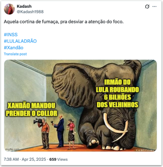 Opositores do governo do presidente Luiz Inácio Lula da Silva (PT) e bolsonaristas compartilharam memes no X sobre o esquema de descontos indevidos em aposentadorias e pensões do INSS (Instituto Nacional do Seguro Social), que pode ter desviado mais de R$ 6 bilhões.