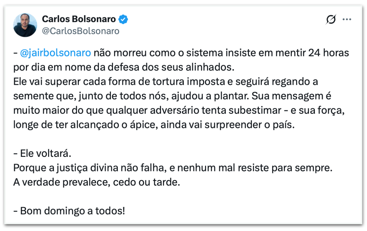 “[Bolsonaro] não morreu como o sistema insiste em mentir 24 horas por dia em nome da defesa dos seus alinhados. Ele vai superar cada forma de tortura imposta e seguirá regando a semente que, junto de todos nós, ajudou a plantar. Sua mensagem é muito maior do que qualquer adversário tenta subestimar –e sua força, longe de ter alcançado o ápice, ainda vai surpreender o país”, escreveu no X.