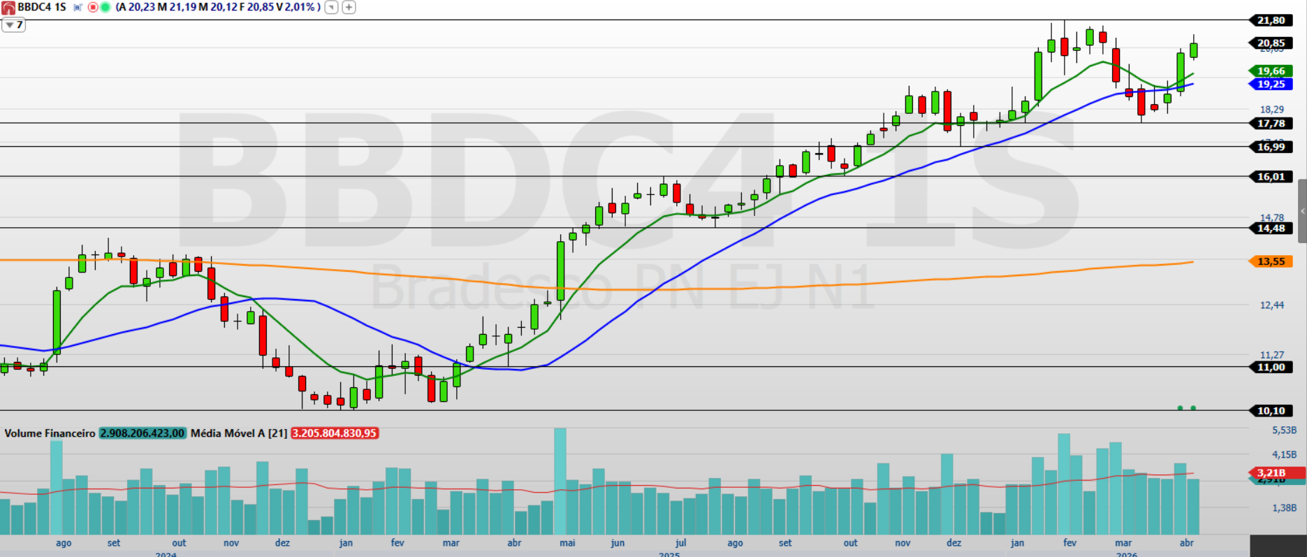 No médio prazo, a estrutura permanece construtiva. O Bradesco segue em tendência de alta no gráfico semanal, com topos e fundos ascendentes e negociação acima das médias de 9 e 21 períodos. Após renovar a máxima histórica em R$ 21,80, o ativo passou por uma correção até R$ 17,78, onde encontrou suporte relevante e voltou a atrair fluxo comprador.