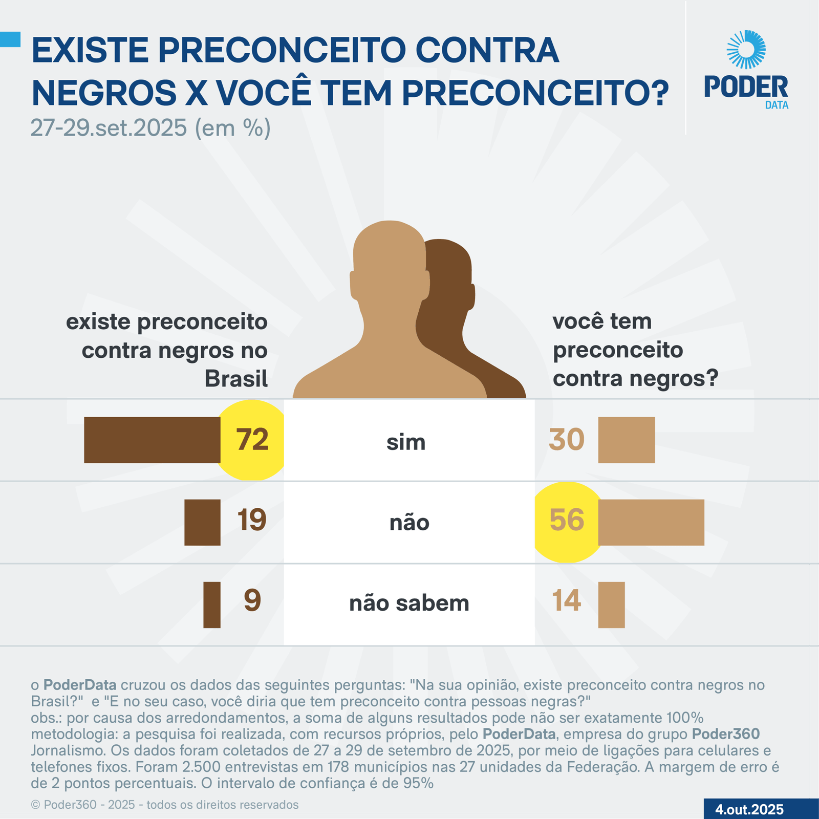 A maioria dos brasileiros (72%) diz haver racismo no Brasil. Mas só 30% admitem que têm preconceito contra negros, segundo pesquisa PoderData realizada de 27 a 29 de setembro de 2025.