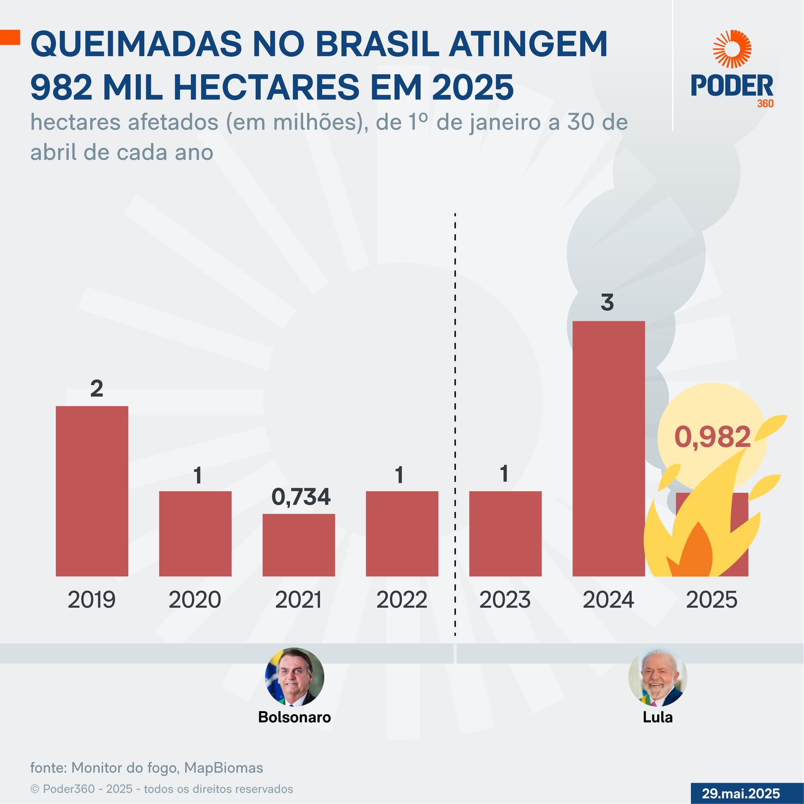 A área queimada no Brasil de janeiro a abril deste ano foi 67,3% menor do que no mesmo período do ano passado. Dados divulgados nesta 4ª feira (16.abr.2025) pelo Monitor do Fogo, do MapBiomas, indicam que 982.495 hectares foram devastados pelo fogo nos 4 primeiros meses deste ano.