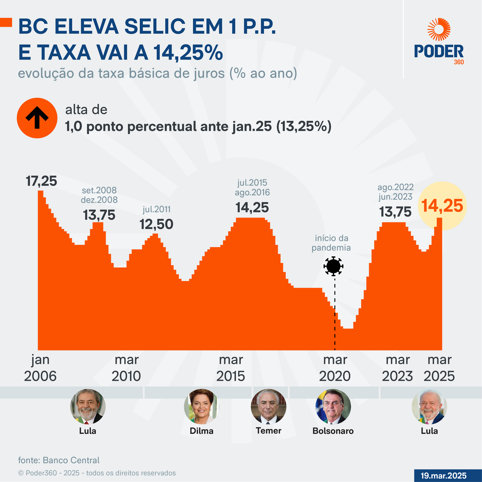 Na última reunião de Campos Neto no Copom (Comitê de Política Monetária), em dezembro de 2024, o Banco Central elevou a taxa em 1 ponto percentual, passando de 11,25% para 12,25% ao ano.
