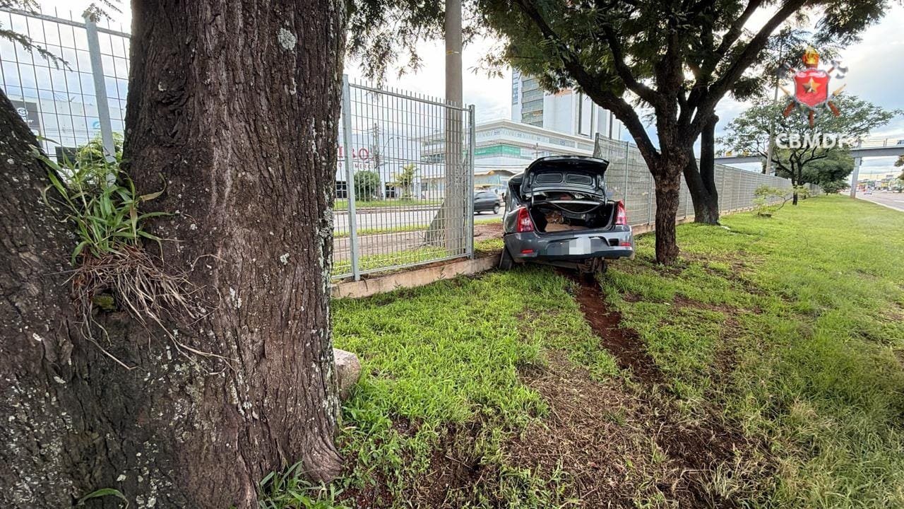 De acordo com o Corpo de Bombeiros Militar do Distrito Federal (CBMDF), a ocorrência foi registrada às 5h46 e mobilizou duas viaturas de socorro. Quando as equipes chegaram, encontraram um Renault Logan, de cor cinza, com a parte dianteira destruída após o impacto contra a árvore.