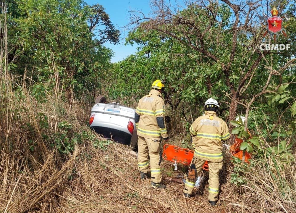 Quando os bombeiros chegaram, encontraram um GM Celta prata fora da estrada de terra, capotado no meio da vegetação. A condutora já estava fora do veículo. Depois da avaliação inicial, seguindo o protocolo de trauma, os socorristas constataram que ela estava consciente e orientada. A vítima foi estabilizada e transportada para o hospital.