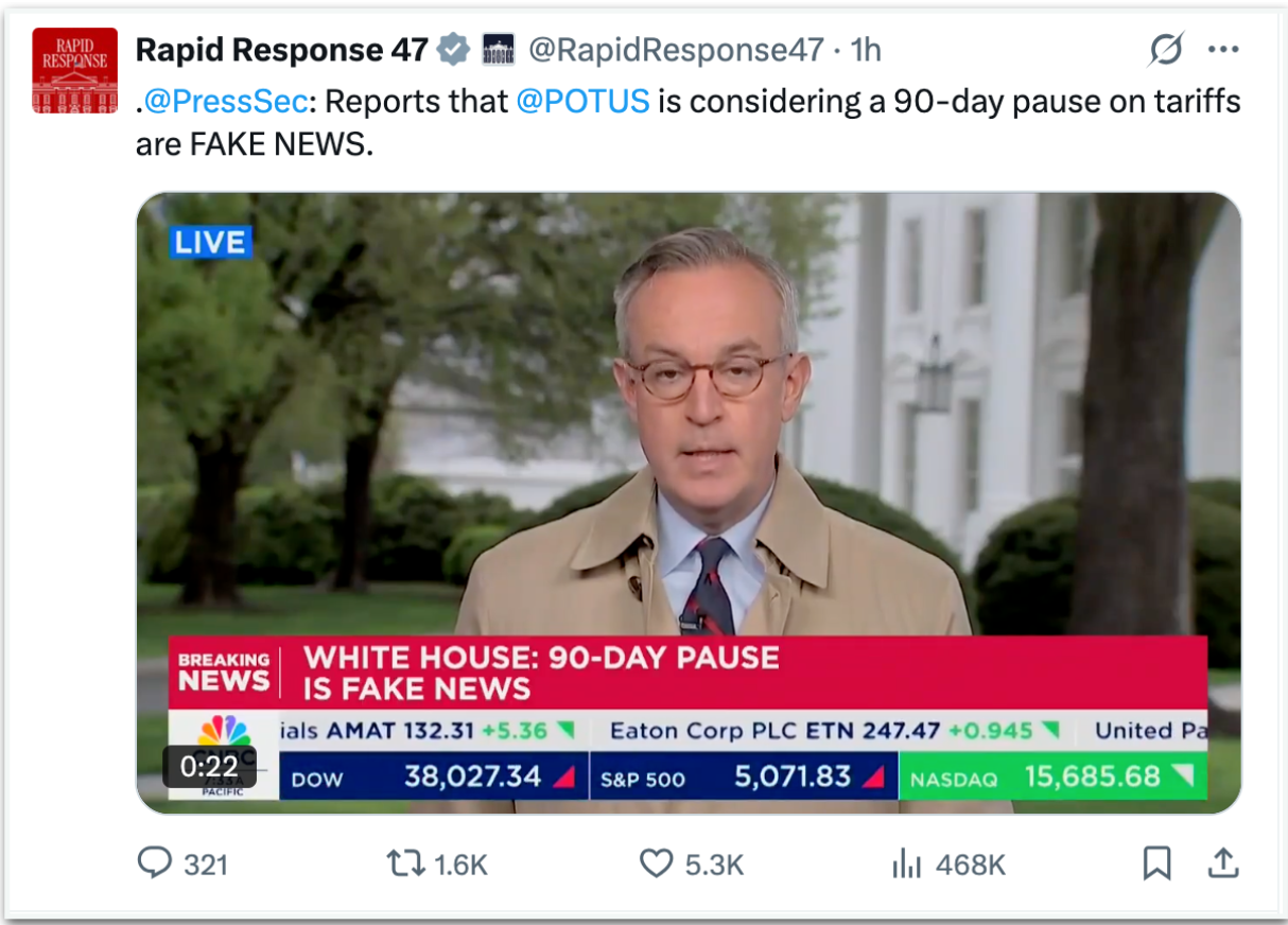 O rumor inicial surgiu depois de o conselheiro econômico nacional dos EUA, Kevin Hassett, afirmar que o republicano considerava uma pausa de 90 dias nas tarifas.