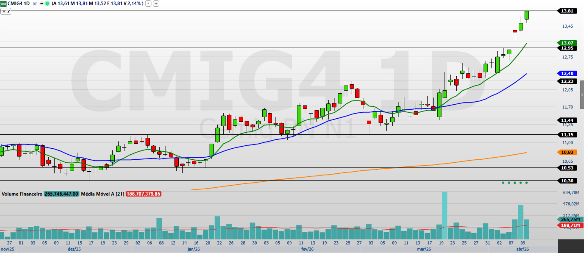 A Cemig (CMIG4) mantém uma trajetória de alta consistente no curto prazo. No gráfico diário, o papel segue negociando acima das médias móveis de 9, 21 e 200 períodos, reforçando o viés positivo e evidenciando a dominância do fluxo comprador. Na última sessão, a ação apresentou alta de 2,14%, encerrando aos R$ 13,81 (nova máxima histórixa), após oscilar entre a mínima de R$ 13,52 e a máxima de R$ 13,81.