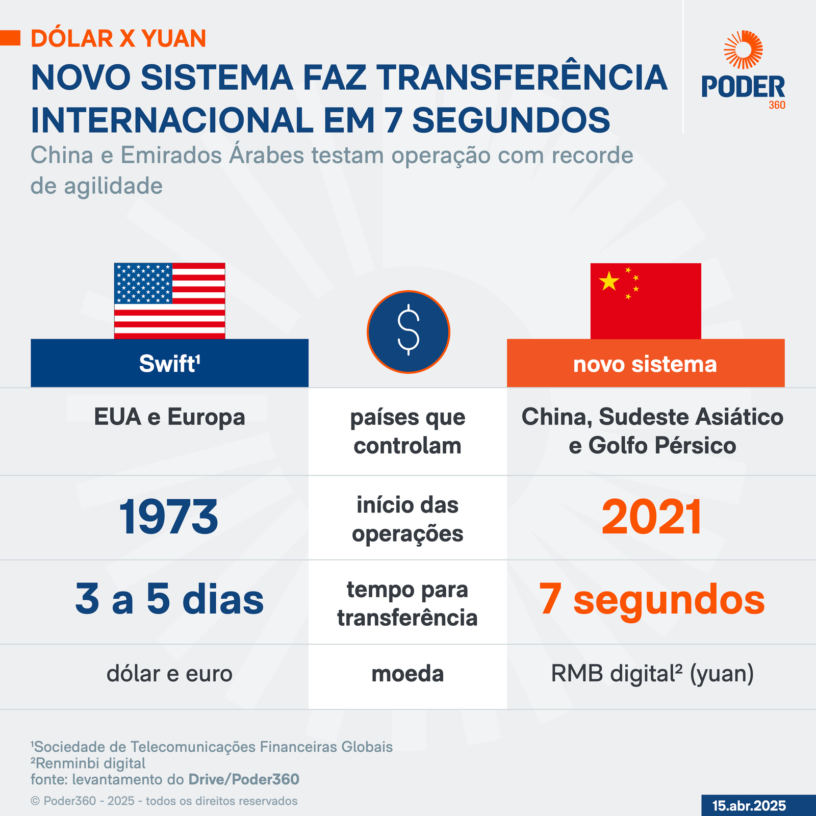 A China e seus aliados deram mais um passo na redução da dependência global do dólar. No início de abril, o governo chinês testou com os Emirados Árabes um modelo de transferência bancária que utiliza o RMB (renminbi) digital, cuja unidade é a moeda chinesa yuan. O resultado foi uma operação sem a necessidade de passar por bancos intermediários e que foi concluída em 7 segundos, um recorde entre grandes transações transfronteiriças.