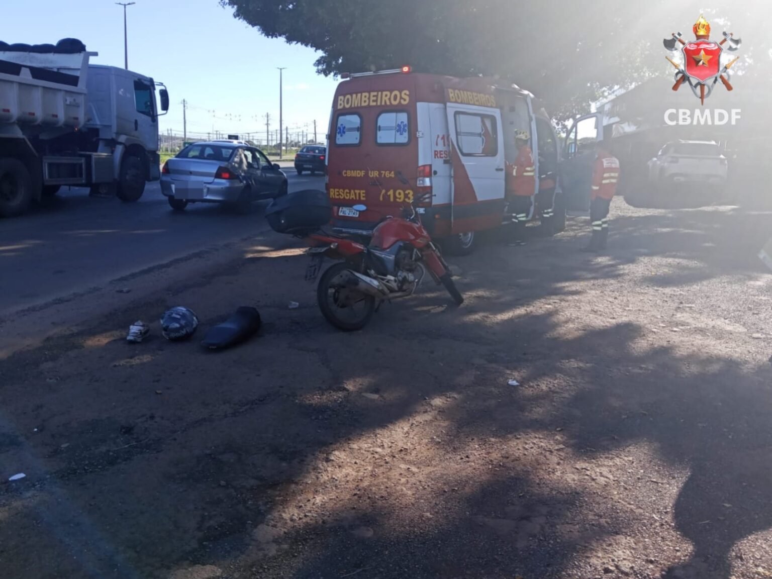 O Corpo de Bombeiros Militar do Distrito Federal (CBMDF) foi acionado. No local, as equipes encontraram uma motocicleta Honda CG, de cor vermelha, que havia se envolvido em uma colisão com um veículo de passeio. O automóvel não estava mais na via no momento da chegada do socorro.