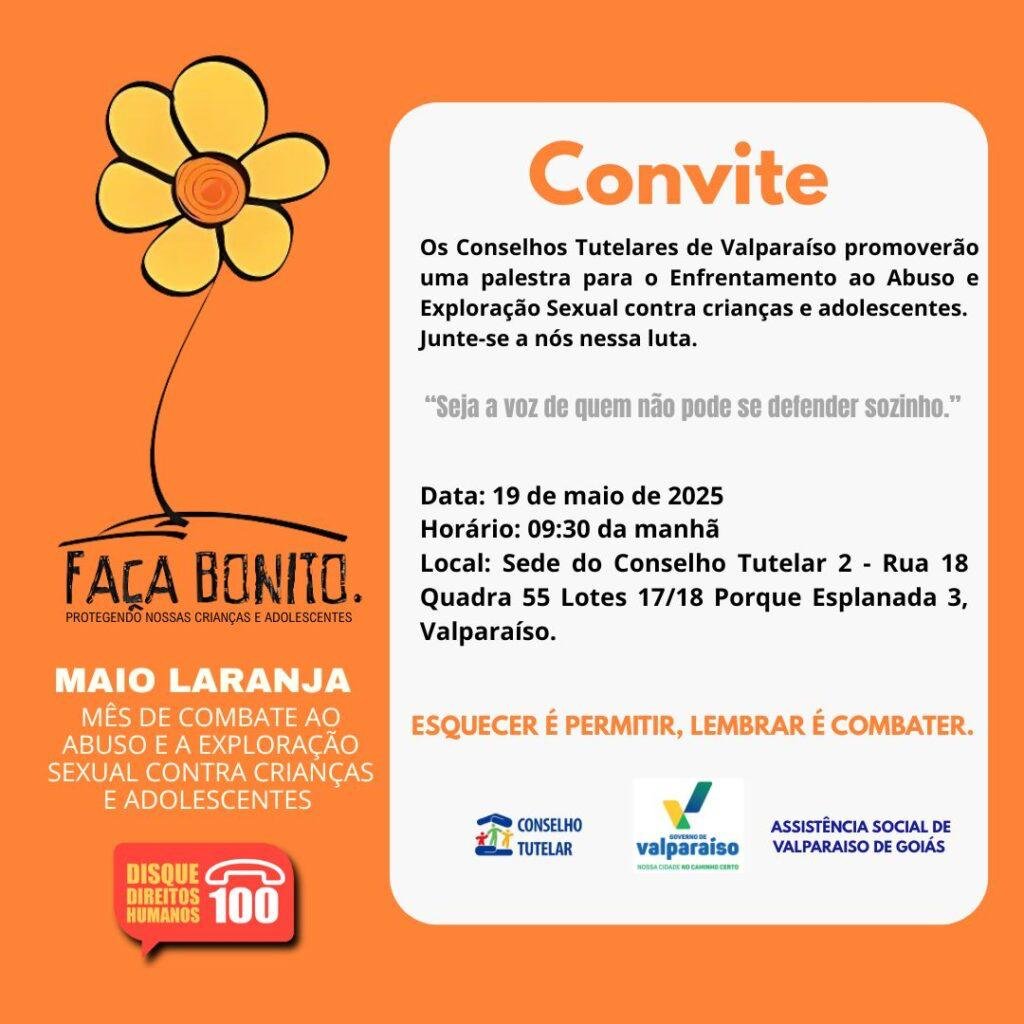 O Dia Nacional de Combate ao Abuso e à Exploração Sexual de Crianças e Adolescentes é comemorado no próximo domingo (18). A data foi instituída pela Lei Federal 9.970/00 sendo uma conquista que demarca a luta pelos Direitos Humanos de Crianças e Adolescentes no Brasil. E, em apoio a causa, os Conselhos Tutelares de Valparaíso de Goiás, em parceria com a Secretaria Municipal de Assistência Social, promovem na próxima segunda-feira (19), uma palestra referente a campanha do “Maio Laranja: Faça Bonito”, voltada para o combate contra a exploração sexual de crianças e adolescentes.