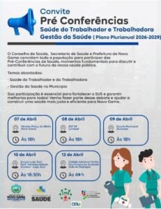 Gestão da Saúde (Plano Plurianual 2026-2029) começam hoje (7), a partir das 18h, no Ginásio da Bíblia e vão até sábado (12), em Novo Gama. A cada dia os encontros acontecerão em locais diferentes. Para ter acesso aos endereços e horários os interessados devem entrar nas redes sociais da Secretaria Municipal de Saúde.