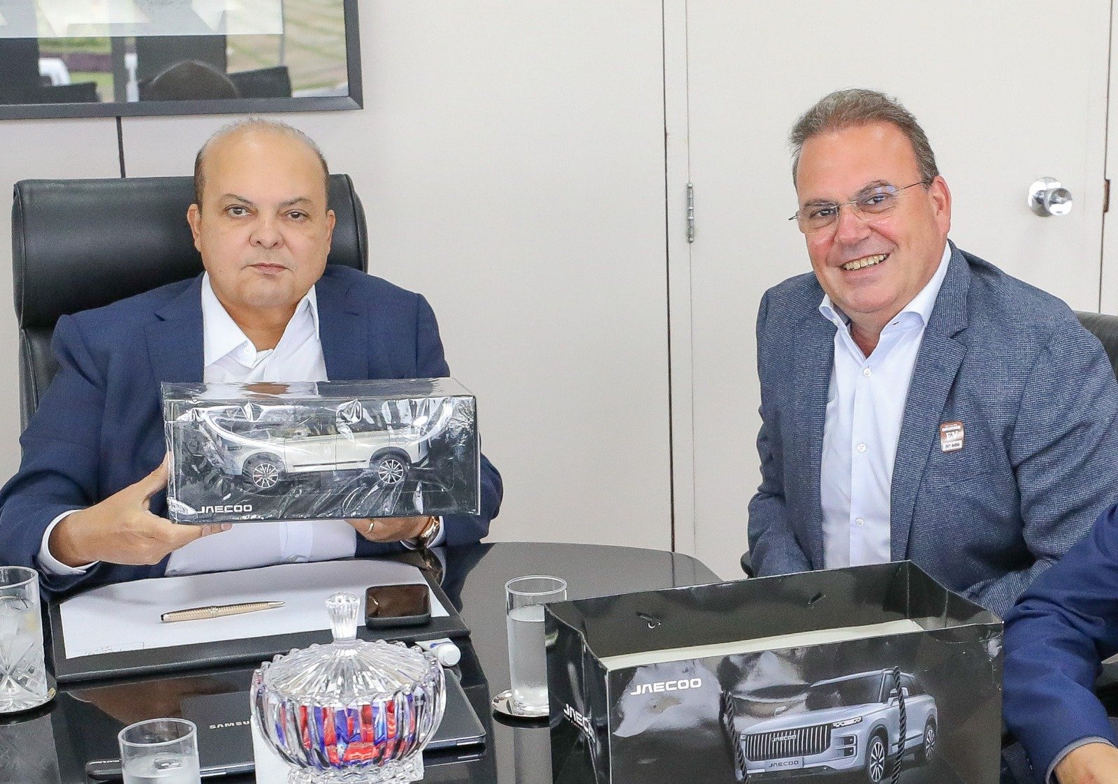 “A vinda dessas montadoras chinesas, com a aposta nos veículos elétricos, vai de encontro com a nossa aposta na sustentabilidade”, afirmou o governador Ibaneis Rocha, ao lado do presidente do grupo Primavia, José Carlos Dourado | Foto: Renato Alves/Agência Brasília