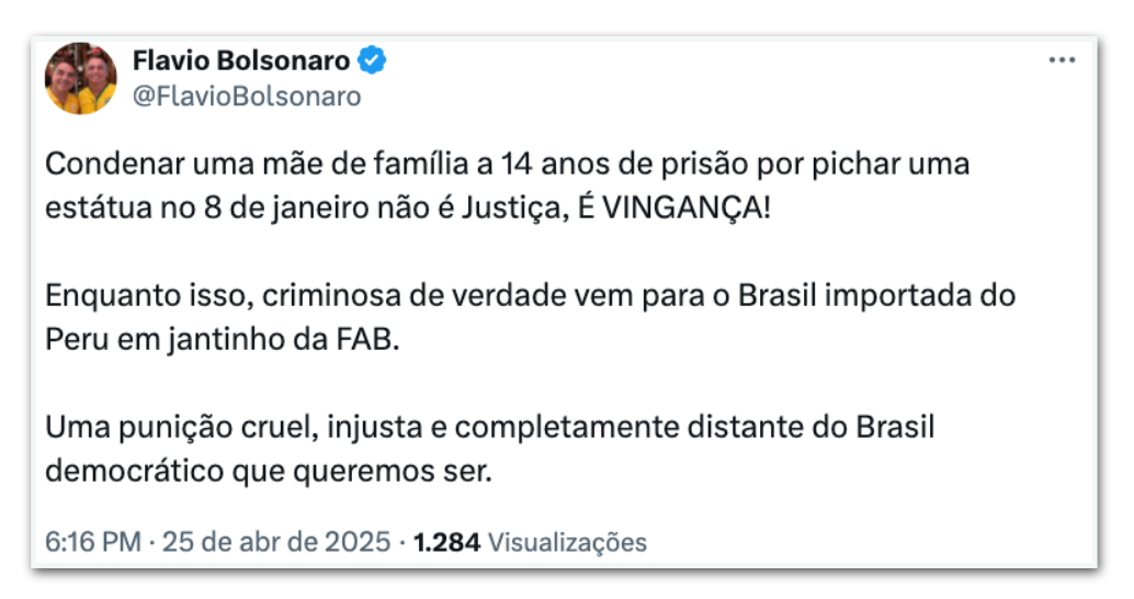 Flávio afirmou em seu perfil oficial no X que a pena é uma “vingança” e declarou: “Enquanto isso, criminosa de verdade vem para o Brasil importada do Peru em jatinho da FAB”.