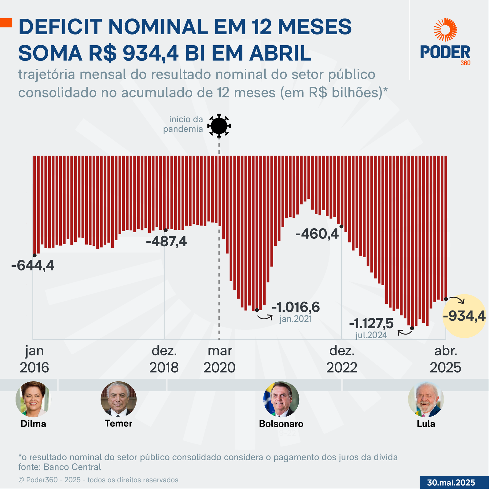 Deficit nominal cai em abril, mas ainda soma R$ 934,3 bi em 1 ano