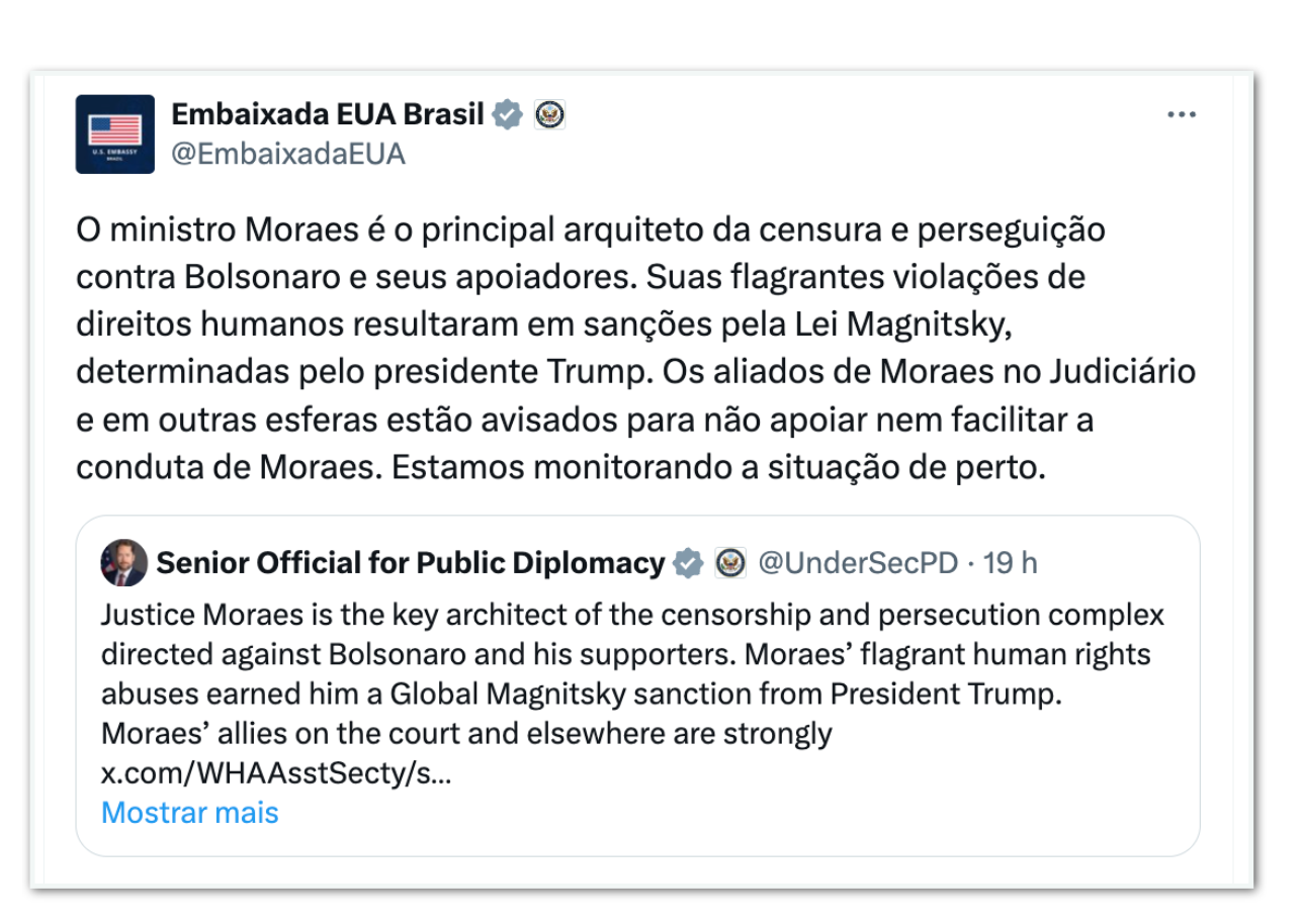 A declaração foi publicada depois que a embaixada dos Estados Unidos no Brasil compartilhou, na 4ª feira (6.ago), uma mensagem com críticas ao ministro Alexandre de Moraes e alertas dirigidos a integrantes do Judiciário que o apoiam. O comunicado foi divulgado nas redes sociais de Darren Beattie, funcionário da diplomacia norte-americana, e indicava que o governo Trump estaria “monitorando a situação de perto”.