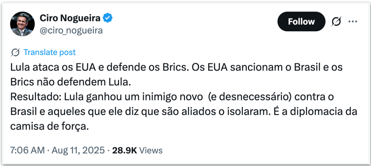 Em publicação em seu perfil do X (ex-Twitter), Nogueira afirmou que Lula “ataca os EUA e defende os Brics”, mas que o bloco formado por Brasil, Rússia, Índia, China e África do Sul e novos integrantes não teria retribuído esse apoio. Segundo o senador, depois das sanções impostas pelos EUA ao Brasil, “os Brics não defendem Lula”.