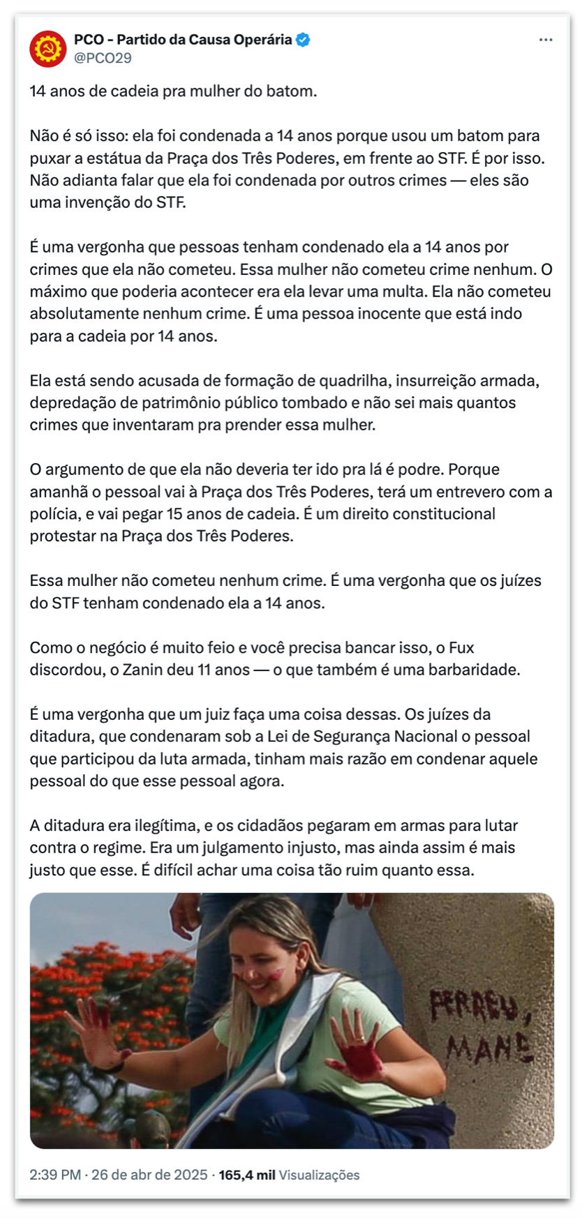 O PCO, partido historicamente ligado à esquerda, usou seu perfil no X no sábado (26.abr.2025) para criticar o STF (Supremo Tribunal Federal) depois de a 1ª Turma condenar Débora Rodrigues dos Santos, a mulher que pichou a estátua “A Justiça” com um batom no 8 de Janeiro, a 14 anos de prisão.