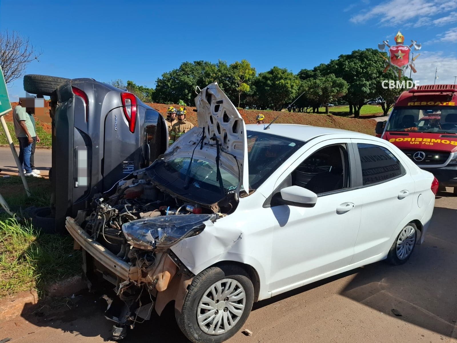 Três viaturas do Corpo de Bombeiros Militar do Distrito Federal (CBMDF) foram enviadas ao local do acidente, na via EPCL. Os veículos envolvidos eram um Fiat Argo de cor cinza e um Ford Ka branco.