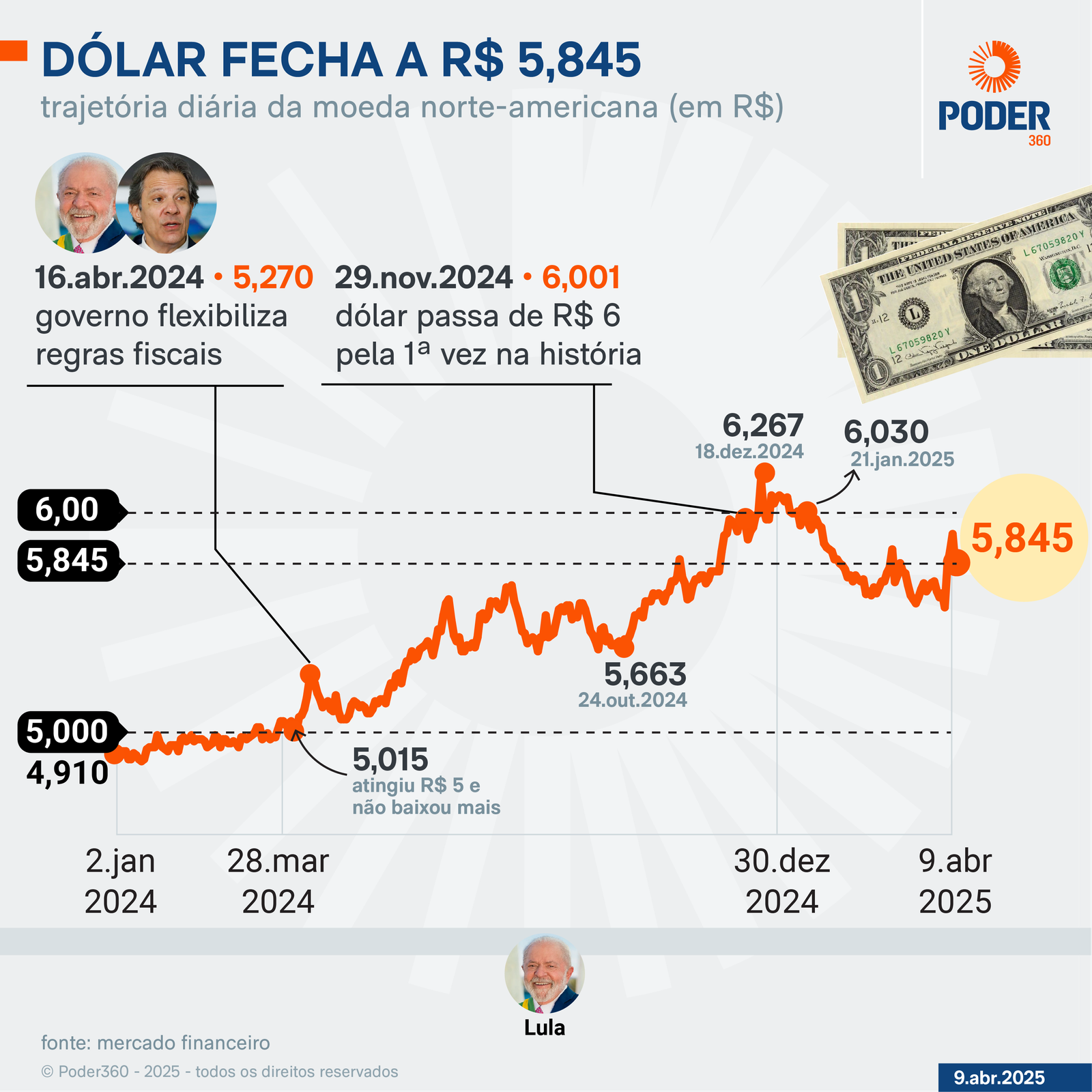 O dólar comercial fechou aos R$ 5,845 nesta 4ª feira (9.abr.2025), com queda de 2,54%. A moeda norte-americana atingiu R$ 6,096 na máxima do dia, mas arrefeceu depois que o presidente dos Estados Unidos, Donald Trump (republicano), anunciou uma trégua de 90 dias às taxas recíprocas acima de 10% e uma taxação de 125% da China.