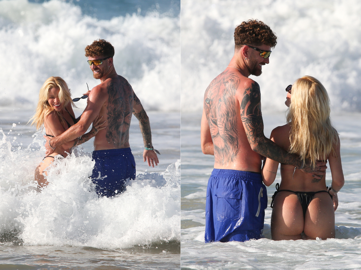 Alessandra Ambrósio entrou no mar acompanhada do namorado, Buck Palmer, que segurava uma prancha de surfFotos: Dilson Silva/ AgNews/ montagem