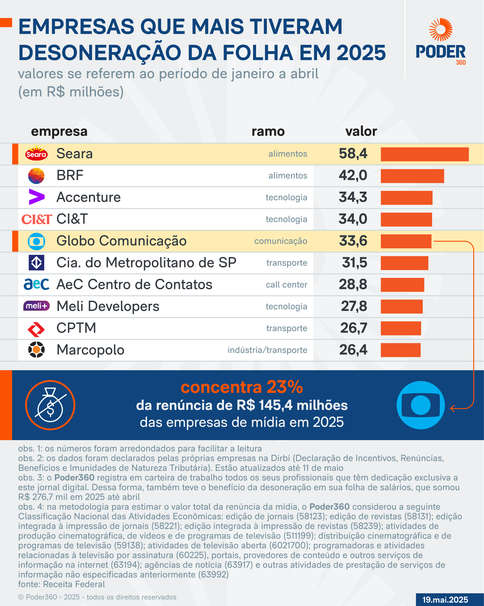 A reoneração da folha de pagamento de salários é um problema para o Grupo Globo como um todo, que é uma empresa de uso intensivo de mão de obra. O conglomerado está entre os 10 que mais têm benefícios com a regra –que está sendo gradualmente desativada e que permitia a algumas empresas no Brasil a pagar menos encargos para o INSS sobre o valor dos trabalhadores empregados.