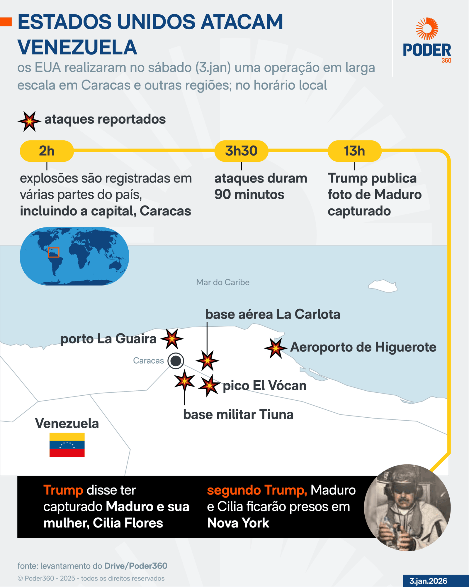 O presidente dos Estados Unidos, Donald Trump (Partido Republicano), anunciou no sábado (3.jan.2026), em seu perfil na rede Truth Social, que o país realizou uma operação militar contra a Venezuela e capturou o presidente Nicolás Maduro (PSUV, esquerda) e a primeira-dama Cilia Flores.