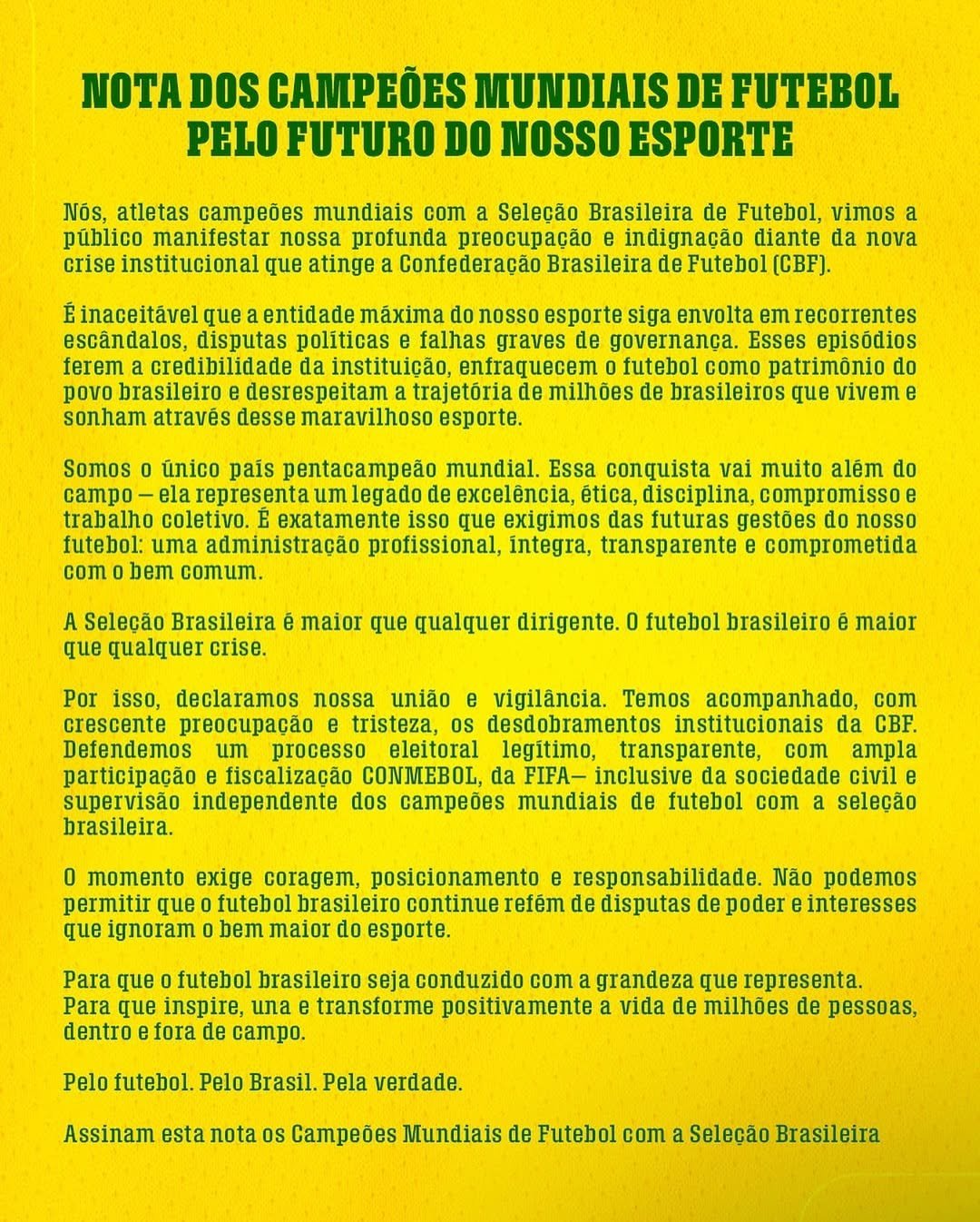No texto, os ex-jogadores afirmam que os constantes episódios de instabilidade política e administrativa na CBF têm comprometido a credibilidade da instituição e ameaçam o legado esportivo construído ao longo de décadas. O documento também faz um apelo por eleições com fiscalização externa e maior participação da sociedade civil, com supervisão da FIFA, da Conmebol e de representantes do próprio grupo de campeões mundiais.