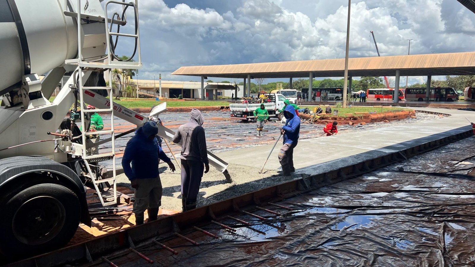 Equipes trabalham no novo pavimento de concreto para substituir a antiga estrutura de piso intertravado, que já não suportava adequadamente o tráfego intenso de ônibus | Foto: Divulgação/SODF